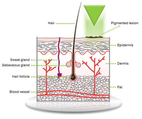 แสงสีเขียวจาก Dual Yellow จะจับกับเมลานินซึ่งเป็นองค์ประกอบหลักของรอยโรคเหล่านี้ โดยที่ไม่ก่อให้เกิดความเสียหายจต่อเนื้อเยื่อรอบข้าง